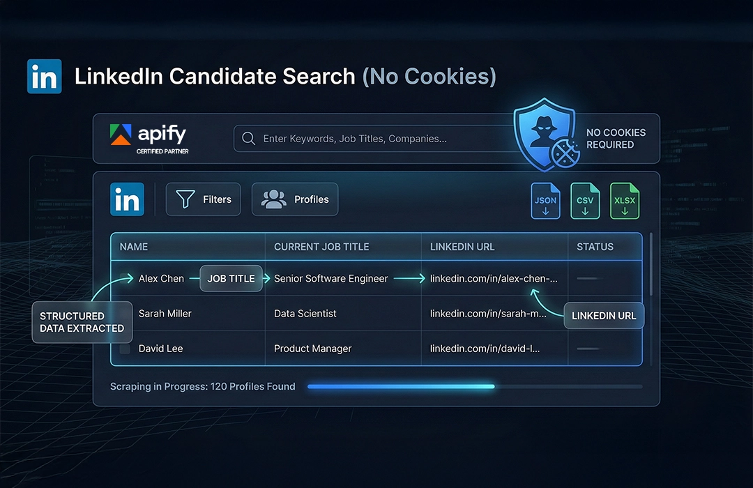 The Linkedin Candidate Search (No cookies) is an Apify Actor designed to extract professional profiles from LinkedIn based on job roles and locations. It uses advanced search simulation with anti-detection measures to provide clean, structured data without requiring a LinkedIn account.