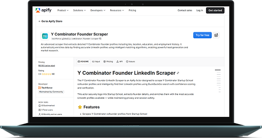 A scraper that extracts detailed Y Combinator founder profiles including bio, location, education, and employment history. It automatically enriches data by finding accurate LinkedIn profiles using intelligent matching algorithms, enabling powerful lead generation and market research.